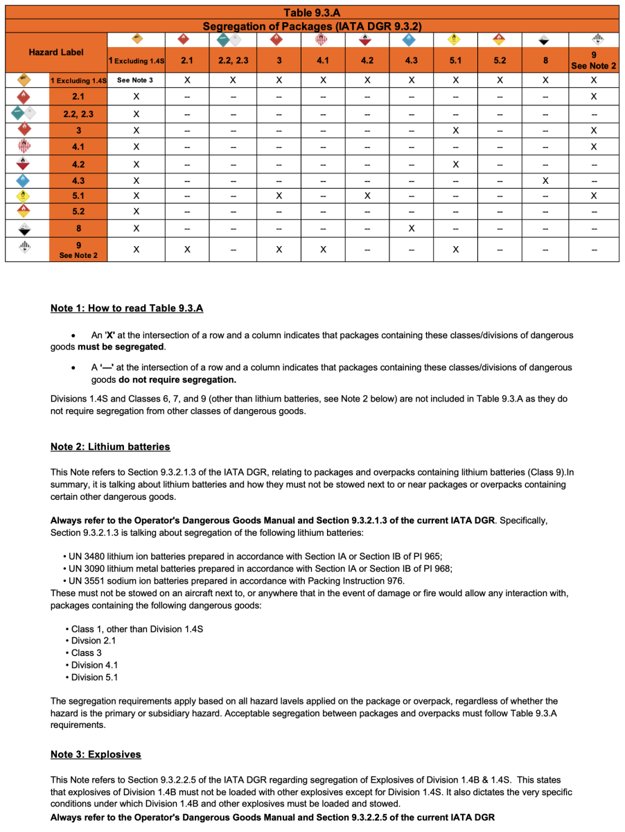 Packages containing dangerous goods that might react dangerously with each other must not be stowed in a position that would allow interaction in the case of leakage. Incompatible dangerous goods must be segregated as stated in Table 9.3.A of the IATA DGR (see below).